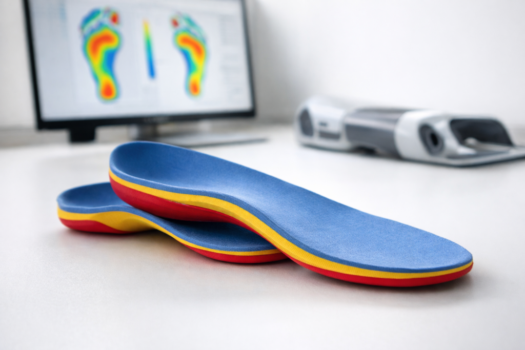 Indywidualne wkładki ortopedyczne poprawiające biomechanikę chodu i komfort codziennego funkcjonowania.